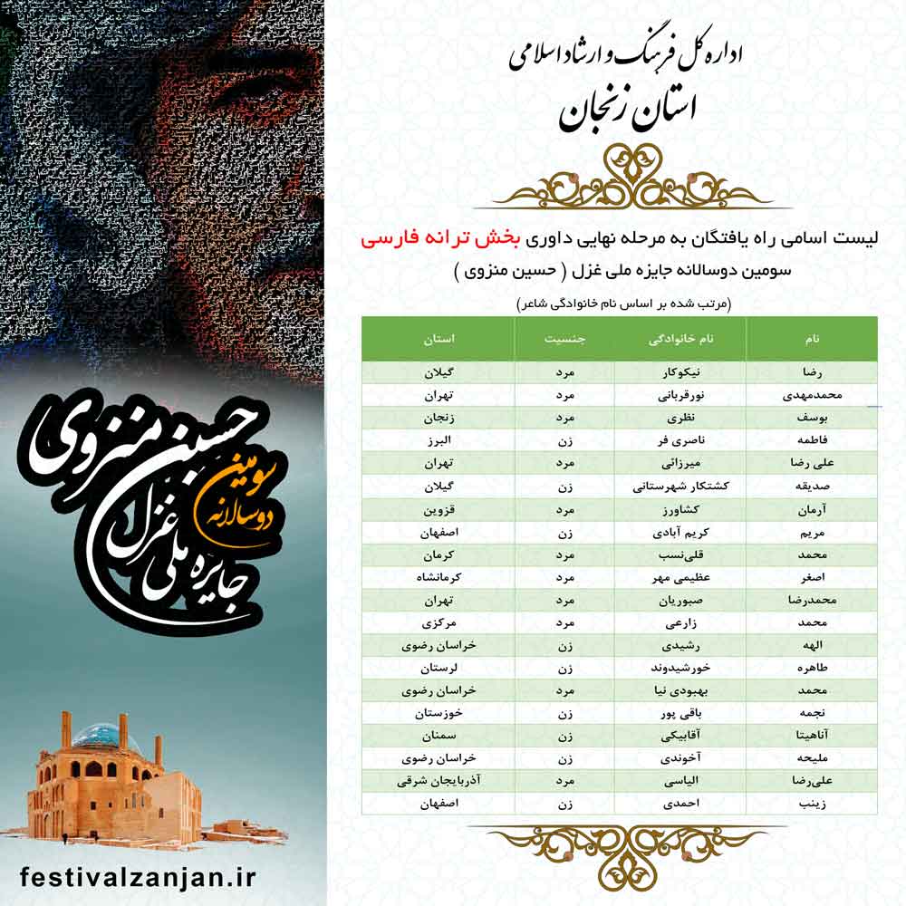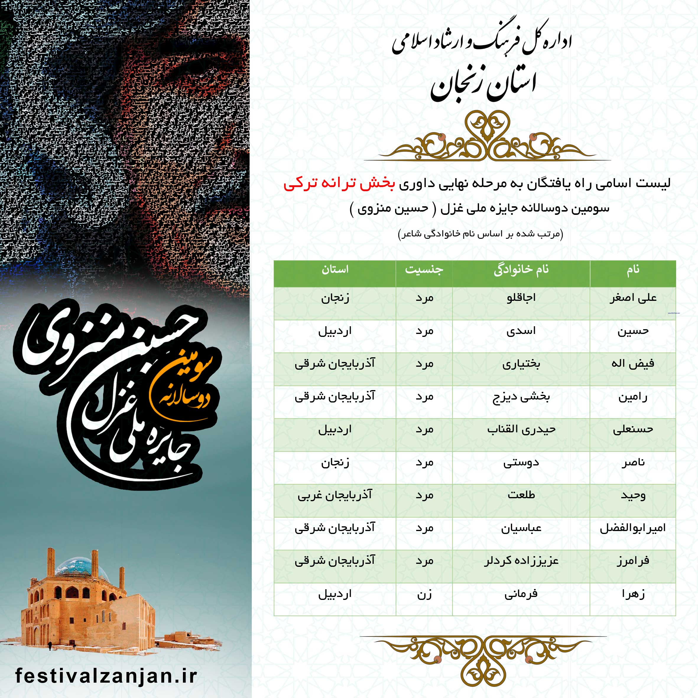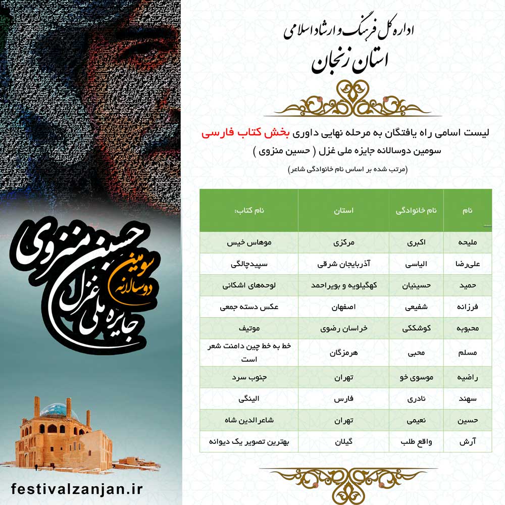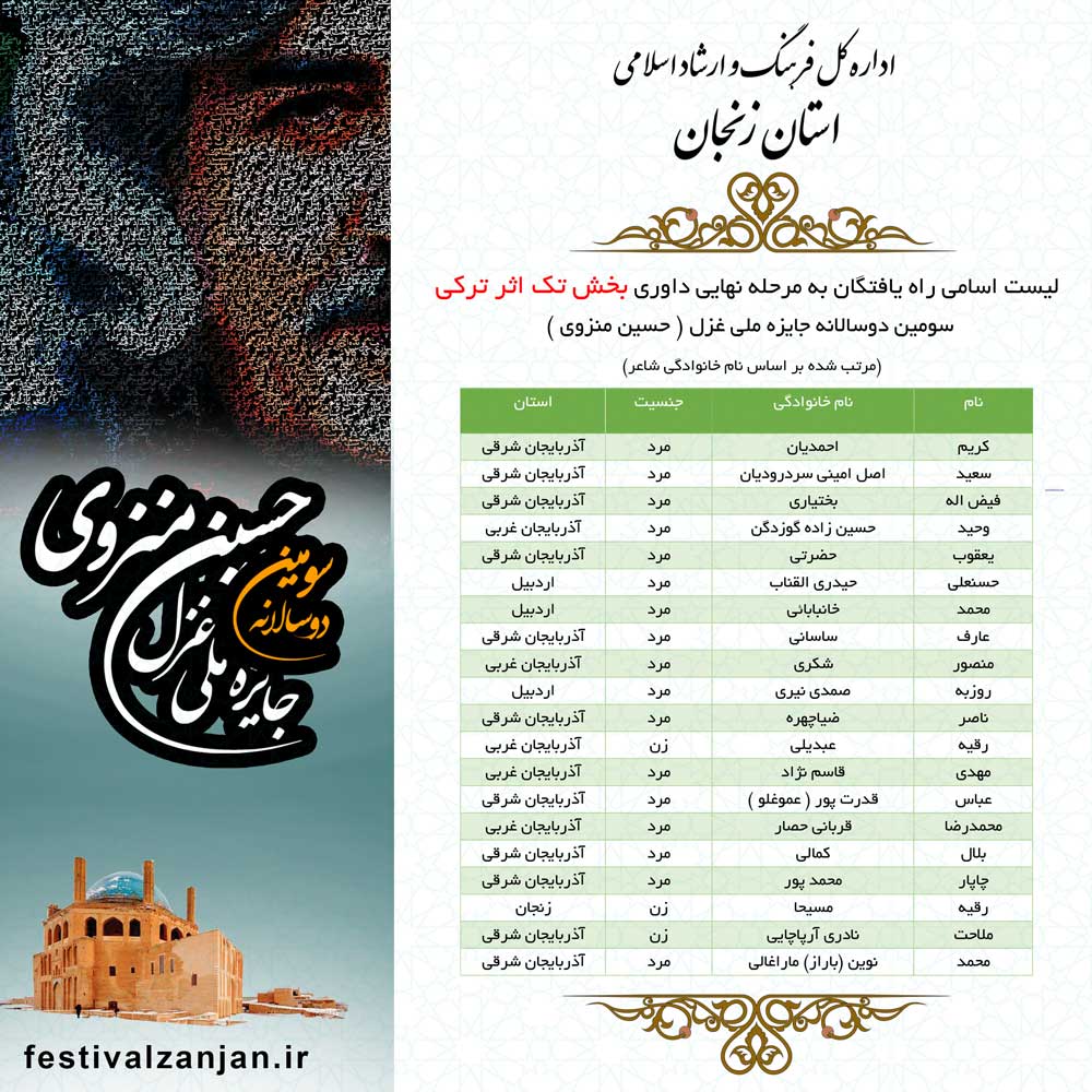 اداره کل فرهنگ و ارشاد اسلامی استان زنجان با همکاری انجمن های ادبی استان و موسسات فرهنگی و هنری، در نظر دارد در راستای منویات مقام معظم رهبری و تاکید معظم له بر اهمیت شعر به عنوان ثروت ملی و همچنین مطابق اهداف، وظایف و سیاست های فرهنگی وزارت فرهنگ و ارشاد اسلامی، سومین دوسالانه جایزه ملی غزل حسین منزوی را برگزارکند. لذا از کلیه اصحاب فرهنگ و هنر و شاعران برای حضور موثر برای شرکت در این رویداد مهم فرهنگی دعوت می کند. این رویداد ملی که در دوره های گذشته با استقبال شاعران و نویسندگان مواجه شده است در دوره سوم با بهره گیری از تجارب دوره های گذشته و تغییرات در برخی از بخش های جایزه برگزار خواهد شد.